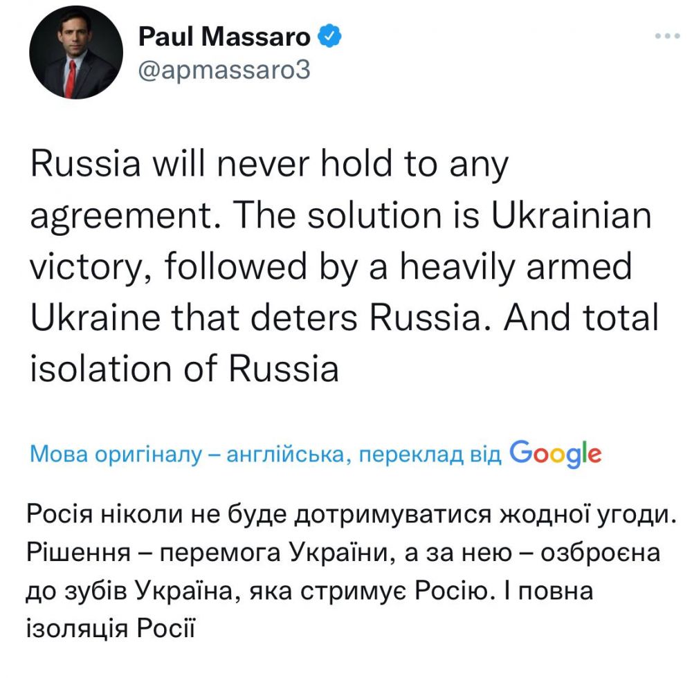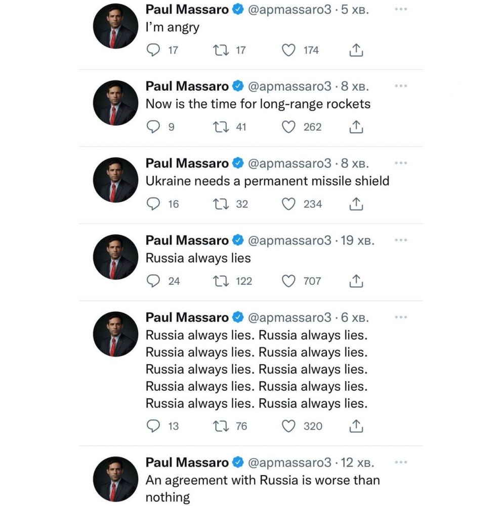Старший радник Конгресу США Пол Массаро закликав надати Україні далекобійні ракети після сьогоднішніх ударів по Одесі