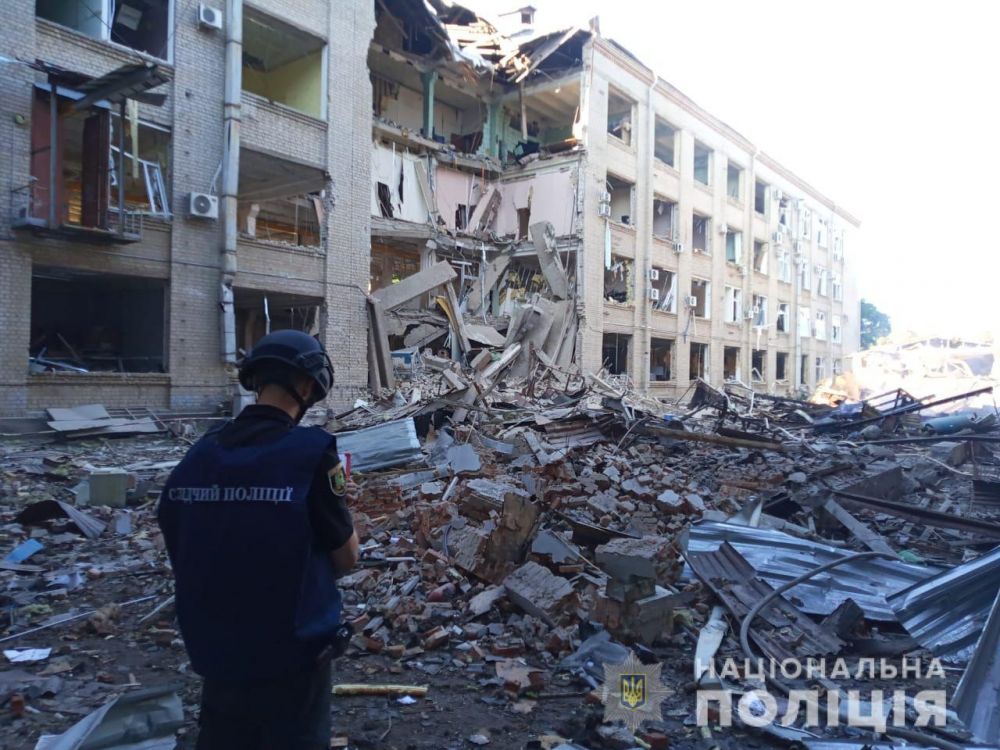Внаслідок влучання ракет сталося загоряння на території споруди, пошкоджені склопакети та фасад.