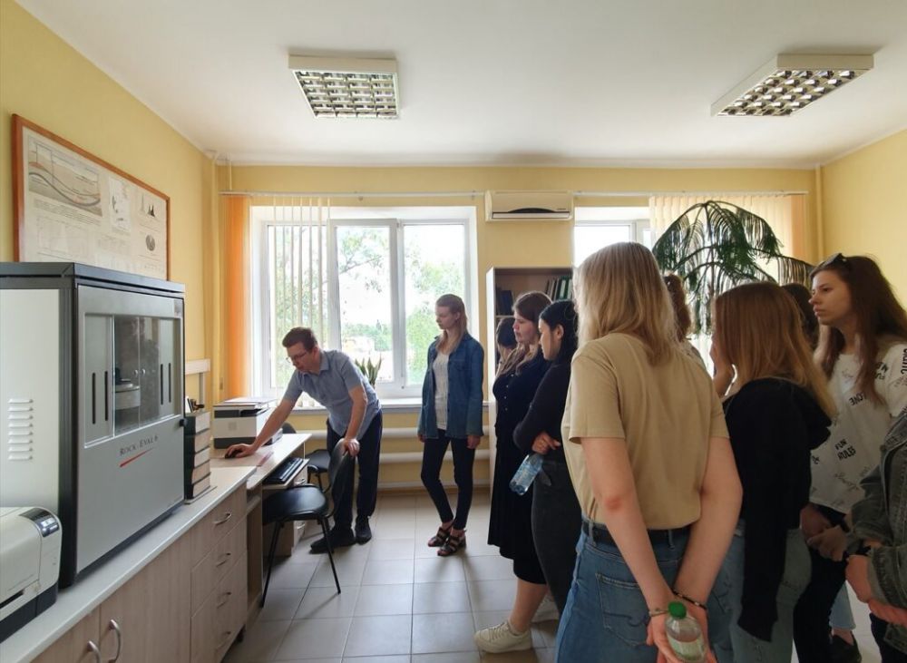 Екскурсію провів заступник начальника комплексної аналітичної лабораторії ДП «Укрнаукагеоцентр» В’ячеслав Мельник. Під час екскурсії студенти мали змогу побачити, як проводяться аналізи та вимірювання, познайомитися з широким спектром методів визначення фізико-хімічних властивостей нафти та конденсатів: густина, в’язкість, вміст води, механічних домішок, асфальто-смолистих речовин, парафіну, сірки, хлористих солей, фракційного складу, молекулярної ваги, температури застигання, тиску насичених парів тощо.