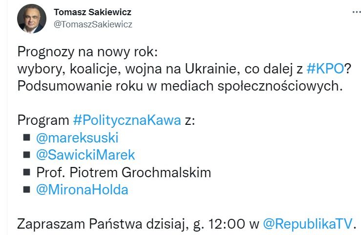 Тематика першої у Новому 2023 році телепередачі «Polityczna coffee» відомого польського політика і журналіста, головного редактора Gazety Polskiej, керівника медіахолдингу SWS Томаша САКЄВІЧА на польскому телеканалі РЕПУБЛІКА стосуватиметься цьогорічних парламентський виборів у Польщі та можливих коаліцій, а також подальшого перебігу війни в Україні.