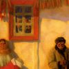 Насправді від хати на полотні лишень стіна, яка – попри пізню осінню днину – є теплою, від неї струмує світла теплінь. Як і від молодої матері з дитям, кольористика вдягачки яких римується з жовто-гарячим контуром віконної рами. Це їхнє вікно, у сьогоднішній і завтрашній день, ще й з промальованим у ньому квітковим овальним віночком.