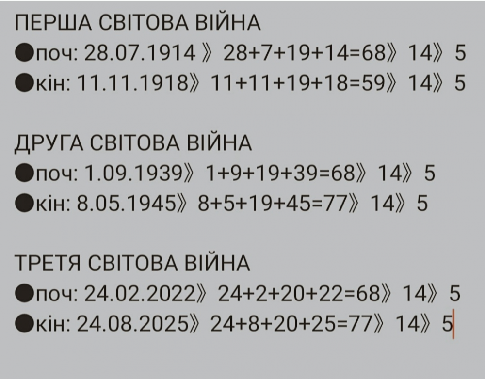 Дати початку і кінця трьох світових воєн перетворимо в нумерологічний ланцюжок, складаючи числа послідовно, щоб привести до однозначного числа. Можна помітити, що в кожний рядку повторюється число «14».